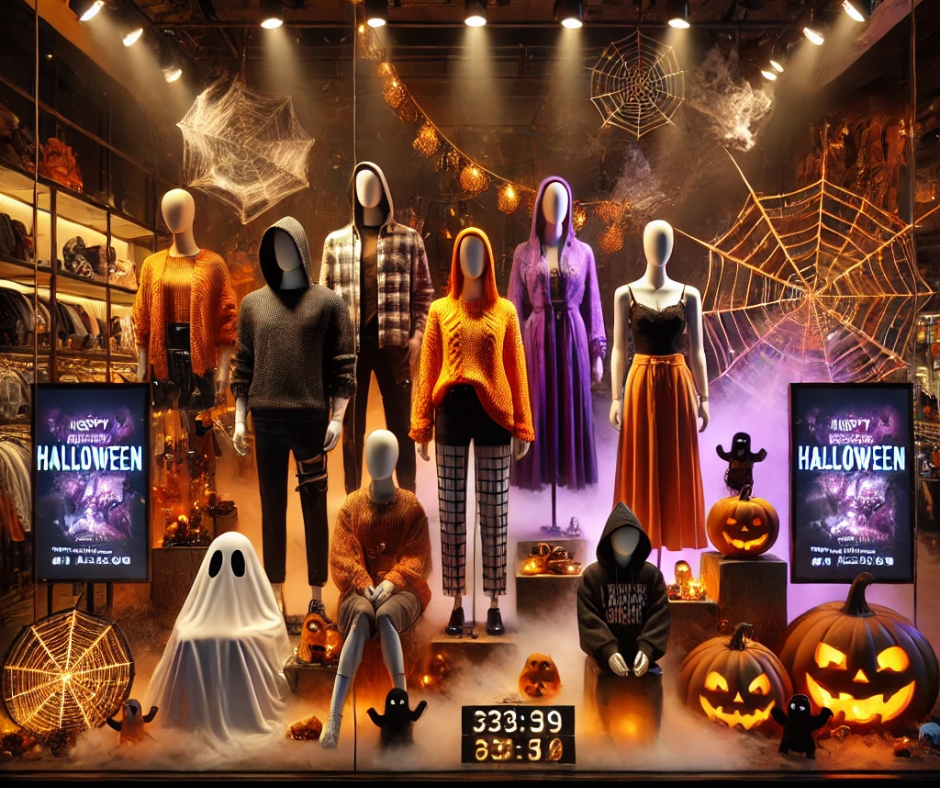 Iluminación tenue en tonos naranjas y púrpuras para crear una atmósfera misteriosa. Elementos interactivos como fantasmas activados por movimiento y pantallas con animaciones, productos de moda envueltos en telarañas y calabazas, y maniquíes decorados con trajes de Halloween .Exhibición creativa de productos utilizando calabazas y telarañas para destacar los artículos. Experiencia inmersiva con efectos de sonido y aromas de temporada (aunque esto, aquí, nos lo tenemos que imaginar ;)-